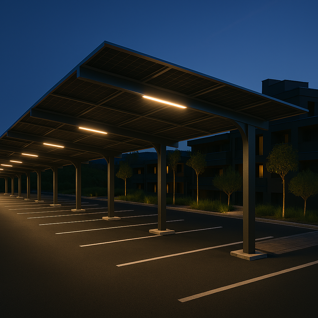 ☀️ Σκεπαστό parking με φωτοβολταϊκά & φωτισμό LEDΗ λύση που συνδυάζει σκίαση, προστασία και εξοικονόμηση ενέργειας.